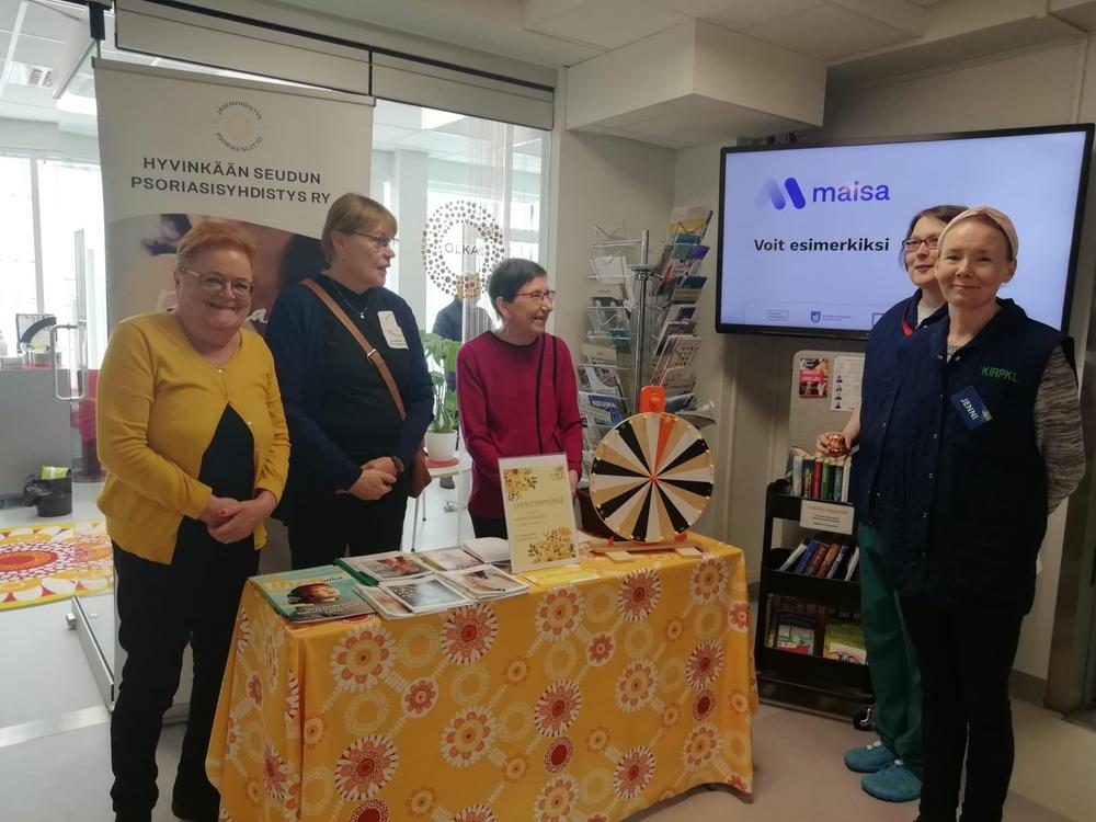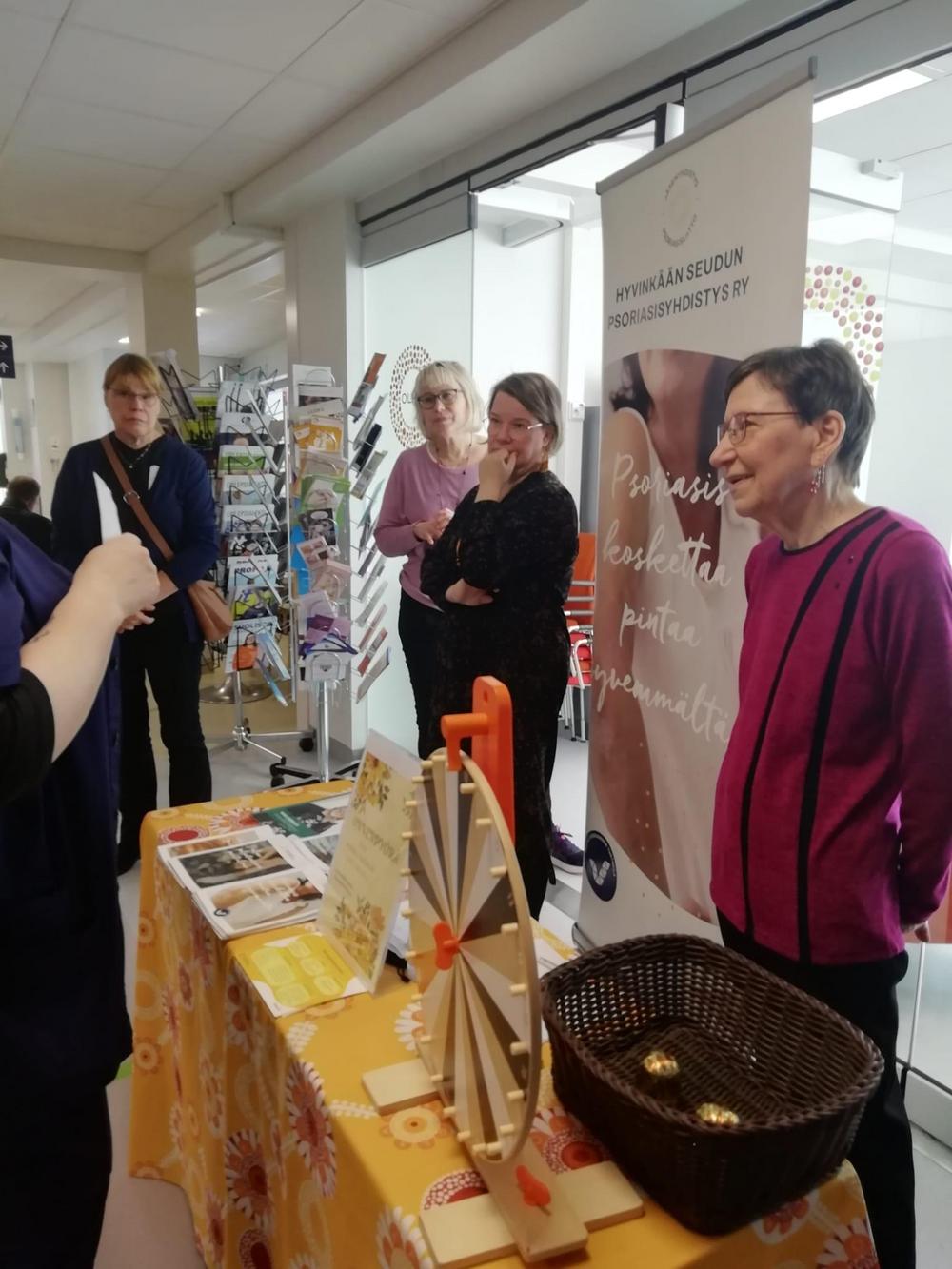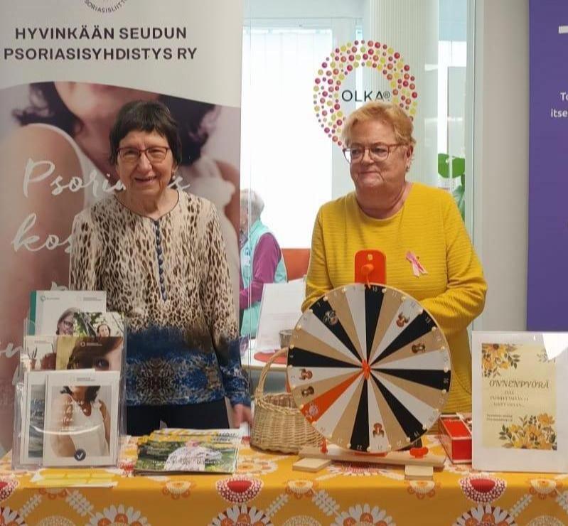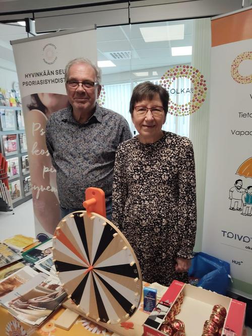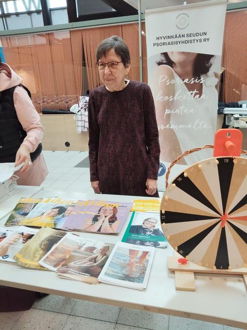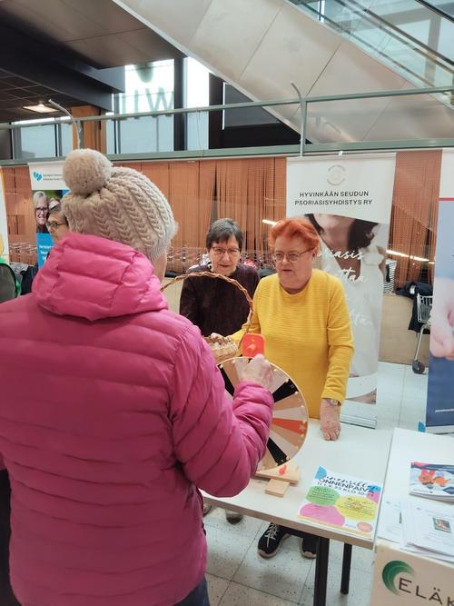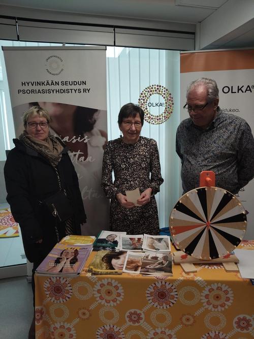 Psoriviikon toisessa tapahtumassa 4.4.2024 olimme Hyvinkään sairaalassa OLKA pisteellä. Kävijät saivat pyörittää onnenpyörää, josta sai palkinnoksi pusun. Pääpalkintona oli risteilylahjakortti, voittajalle on ilmoitettu. Puhuttiin asiasta, siis psorista, ja asian vierestä. Vaikka kaikilla kohtaamillamme ei ollut psoria, moni tiesi jonkun lähipiiristään, työkavereistaan tai ystävistään, sairastavan psoria. Vertaistuki ja yhteisöllisyys on tukena varsinkin juuri diagnoosin saaneelle. Kaiken kaikkiaan tosi mukava kolmetuntinen ja aika kului nopeasti.