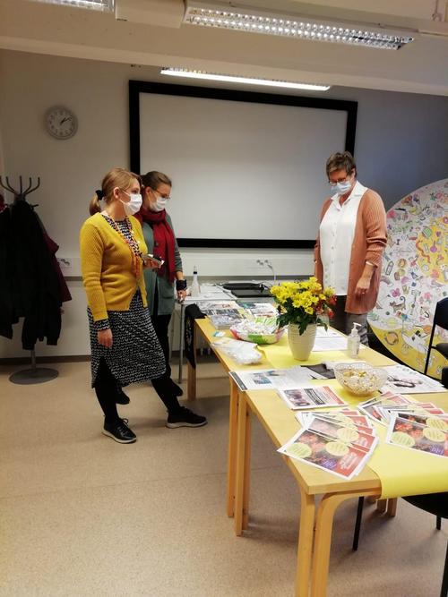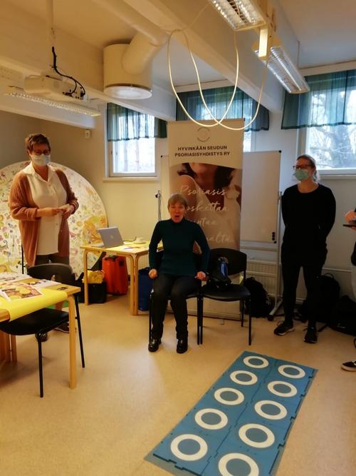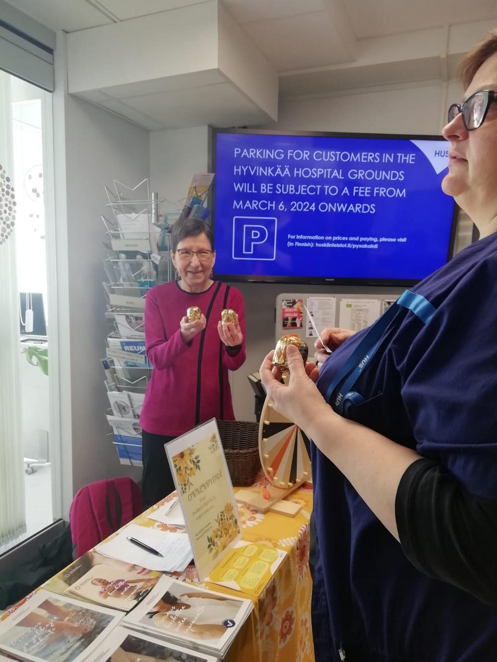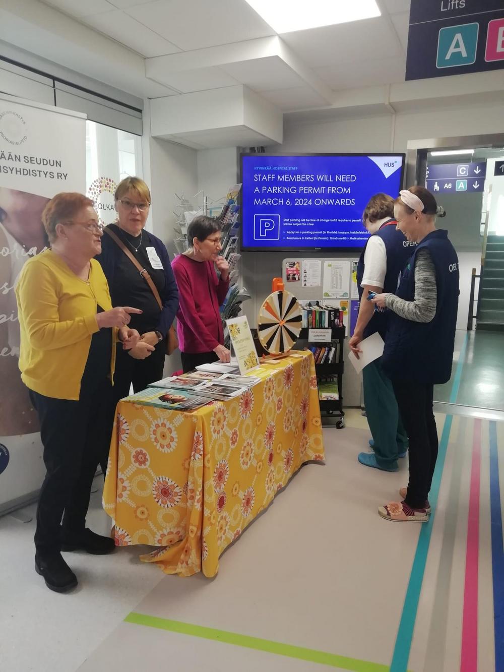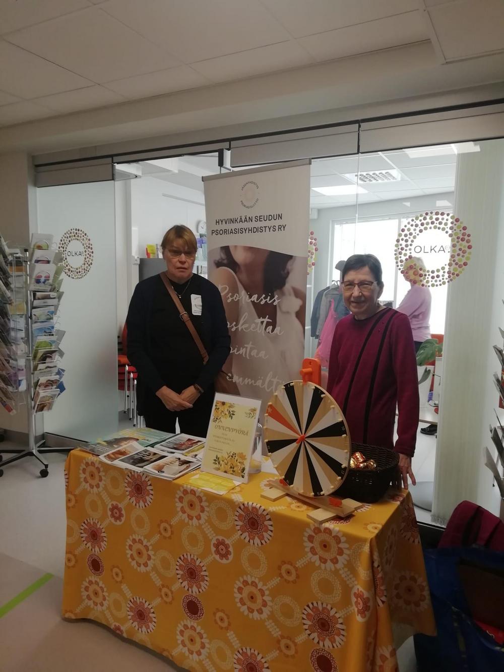 Psoriviikon toisessa tapahtumassa 4.4.2024 olimme Hyvinkään sairaalassa OLKA pisteellä. Kävijät saivat pyörittää onnenpyörää, josta sai palkinnoksi pusun. Pääpalkintona oli risteilylahjakortti, voittajalle on ilmoitettu. Puhuttiin asiasta, siis psorista, ja asian vierestä. Vaikka kaikilla kohtaamillamme ei ollut psoria, moni tiesi jonkun lähipiiristään, työkavereistaan tai ystävistään, sairastavan psoria. Vertaistuki ja yhteisöllisyys on tukena varsinkin juuri diagnoosin saaneelle. Kaiken kaikkiaan tosi mukava kolmetuntinen ja aika kului nopeasti.