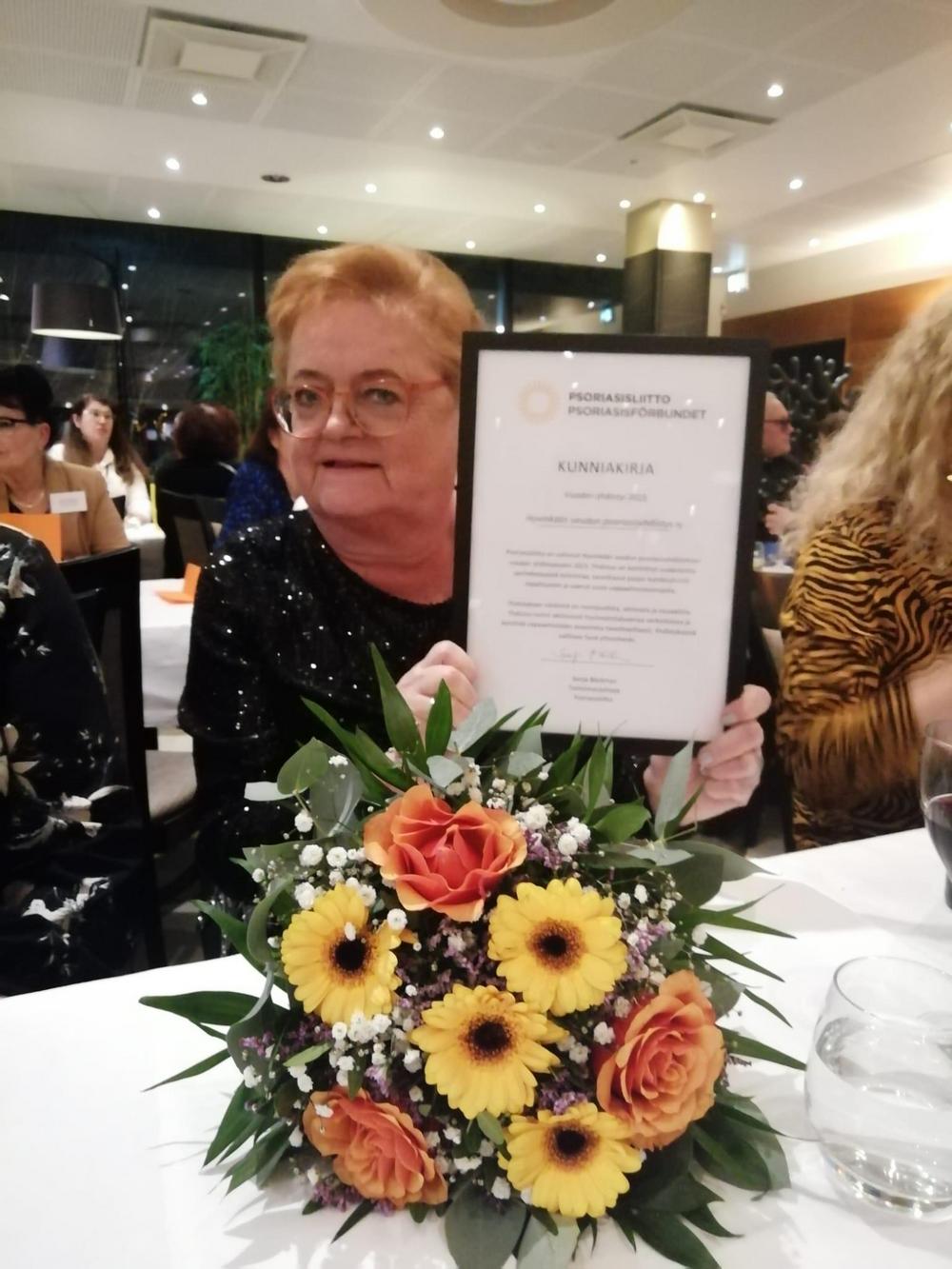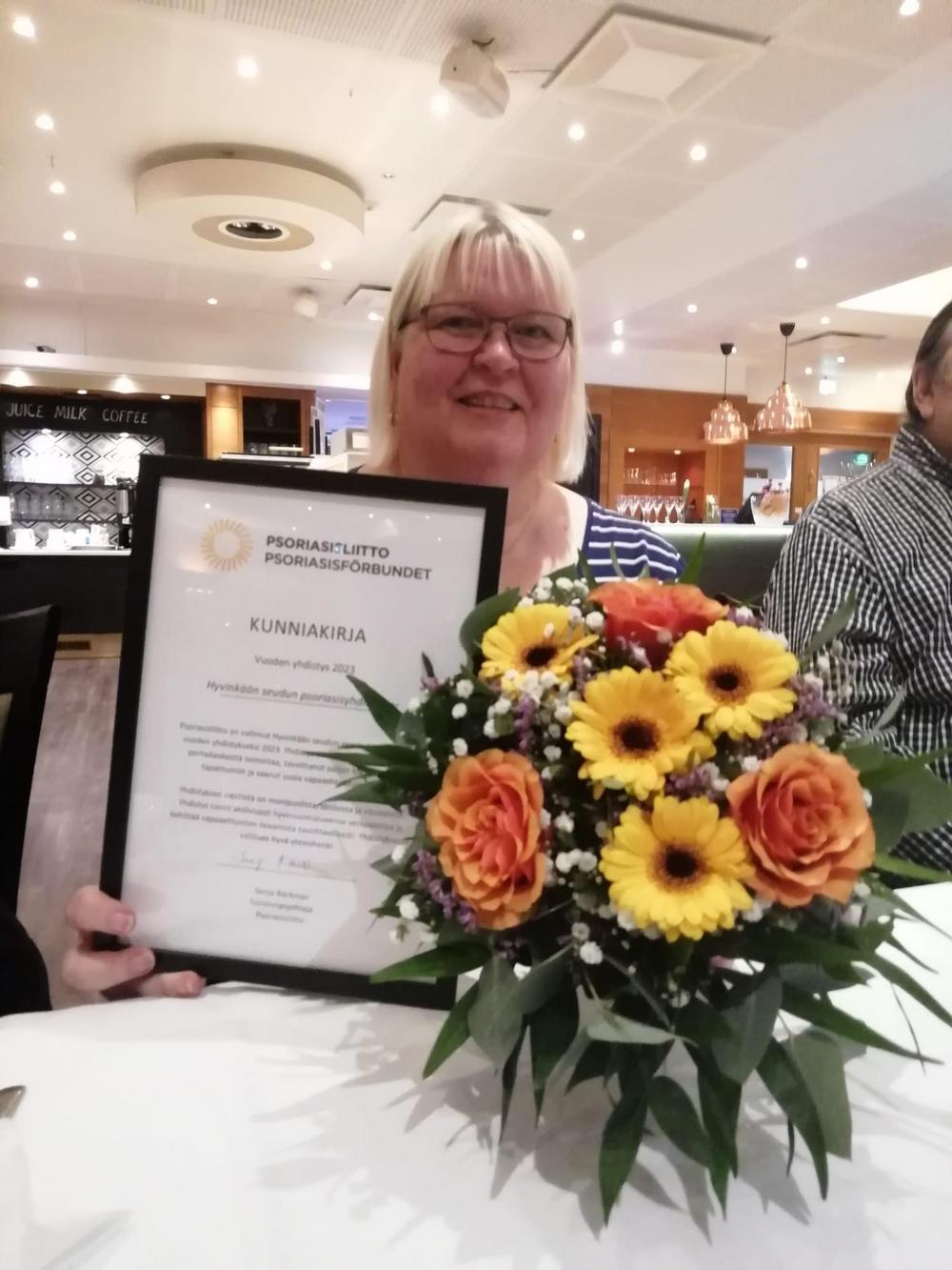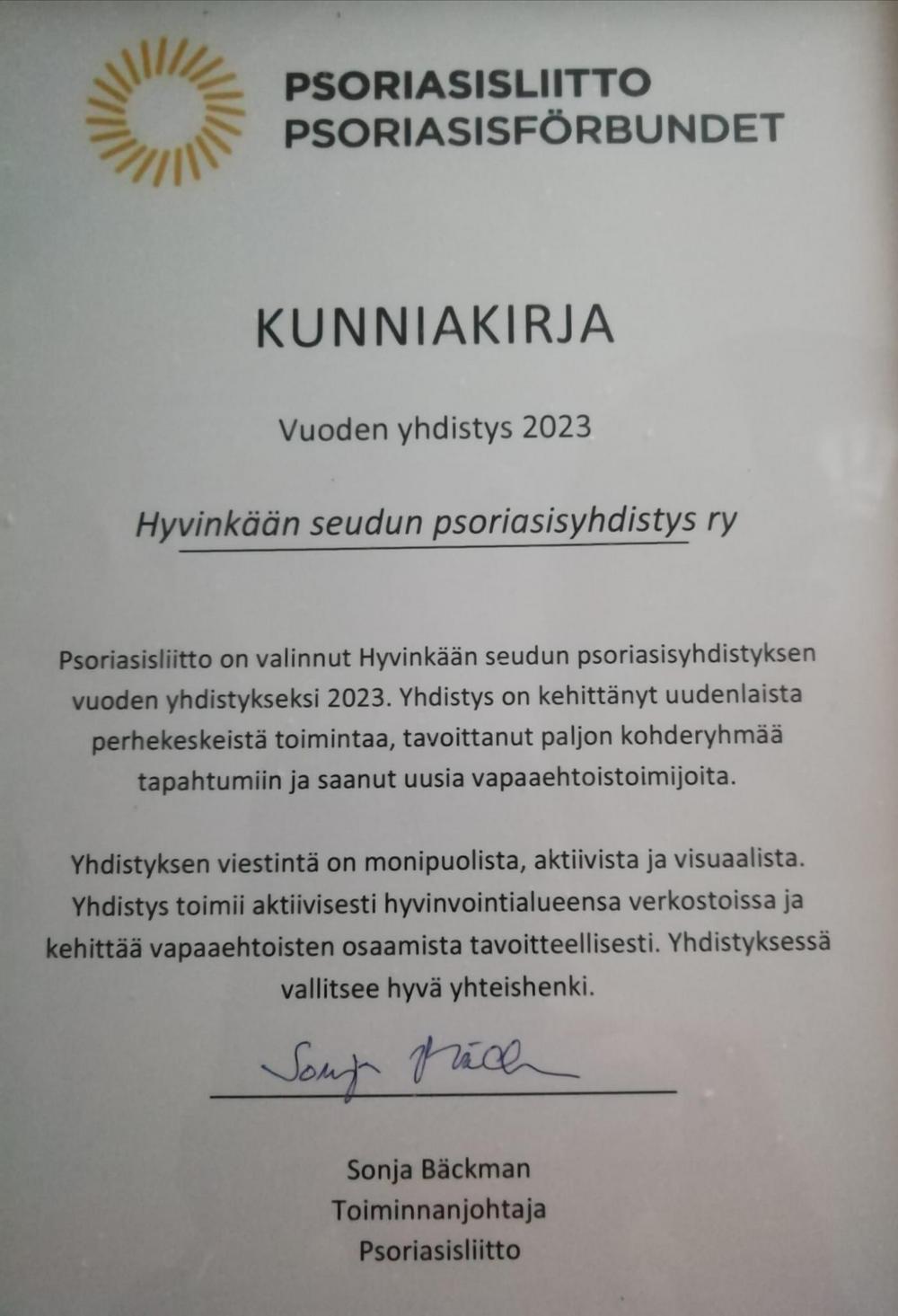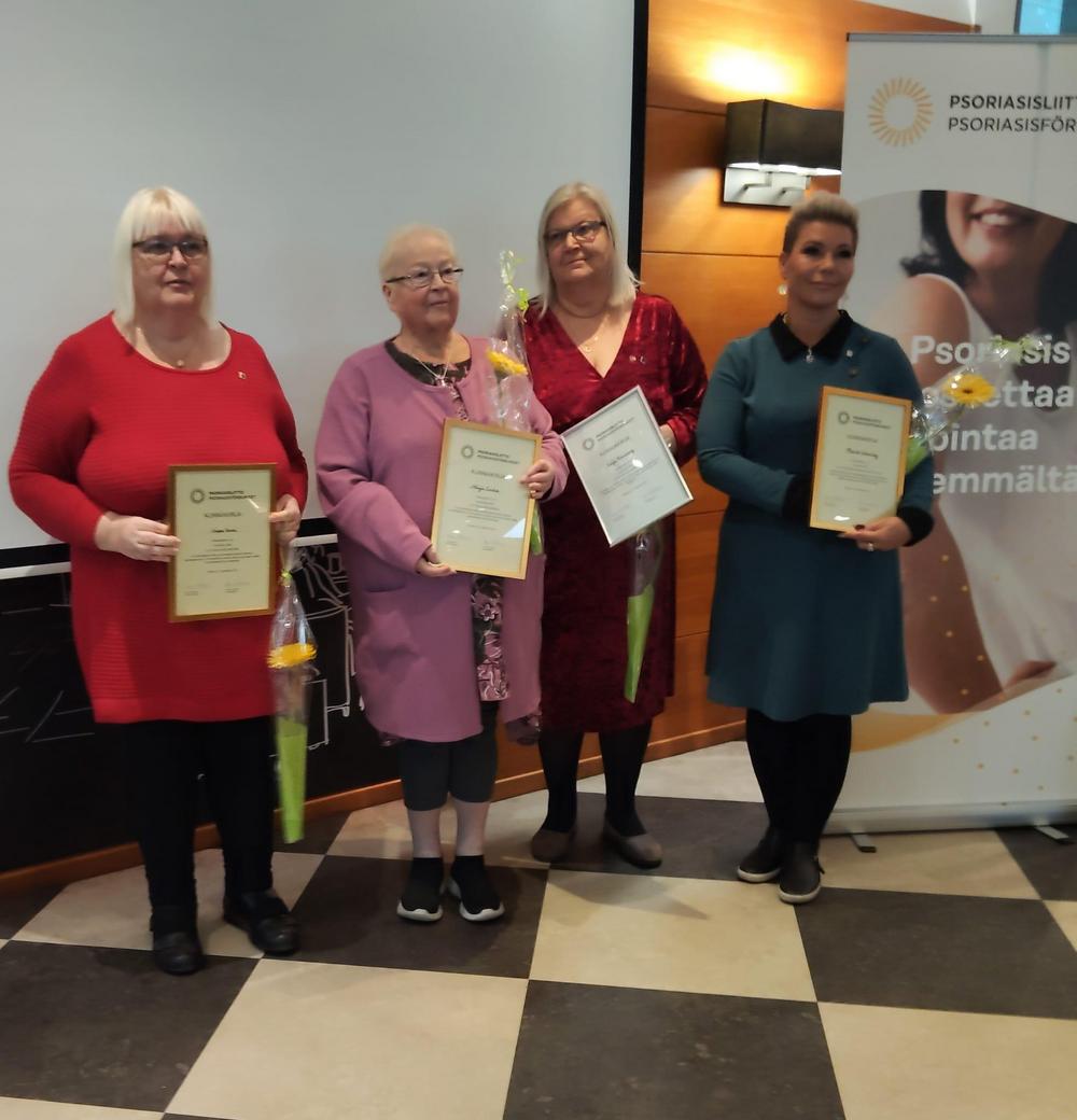 Psoriasisliiton järjestöpäivillä 3.-4.2.2024 Hyvinkään seudun Psoriasisyhdistys palkittiin vuoden 2023 yhdistyksenä. Irene Hämäläinen ja Sirpa Hurri vastaanottivat kunnianosoituksen hyvillä mielin. Lämmin kiitos teille kaikille, jotka olette osallistuneet tapahtumiimme ja kulkeneet mukanamme vaikka viime vuonna tulipalon takia menetimme tutun kokoontumispaikkamme. Toivottavasti näemme myös tämän vuoden menoissa.