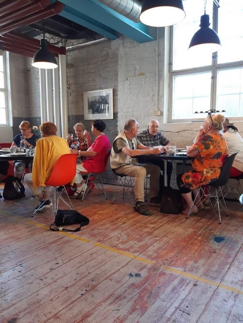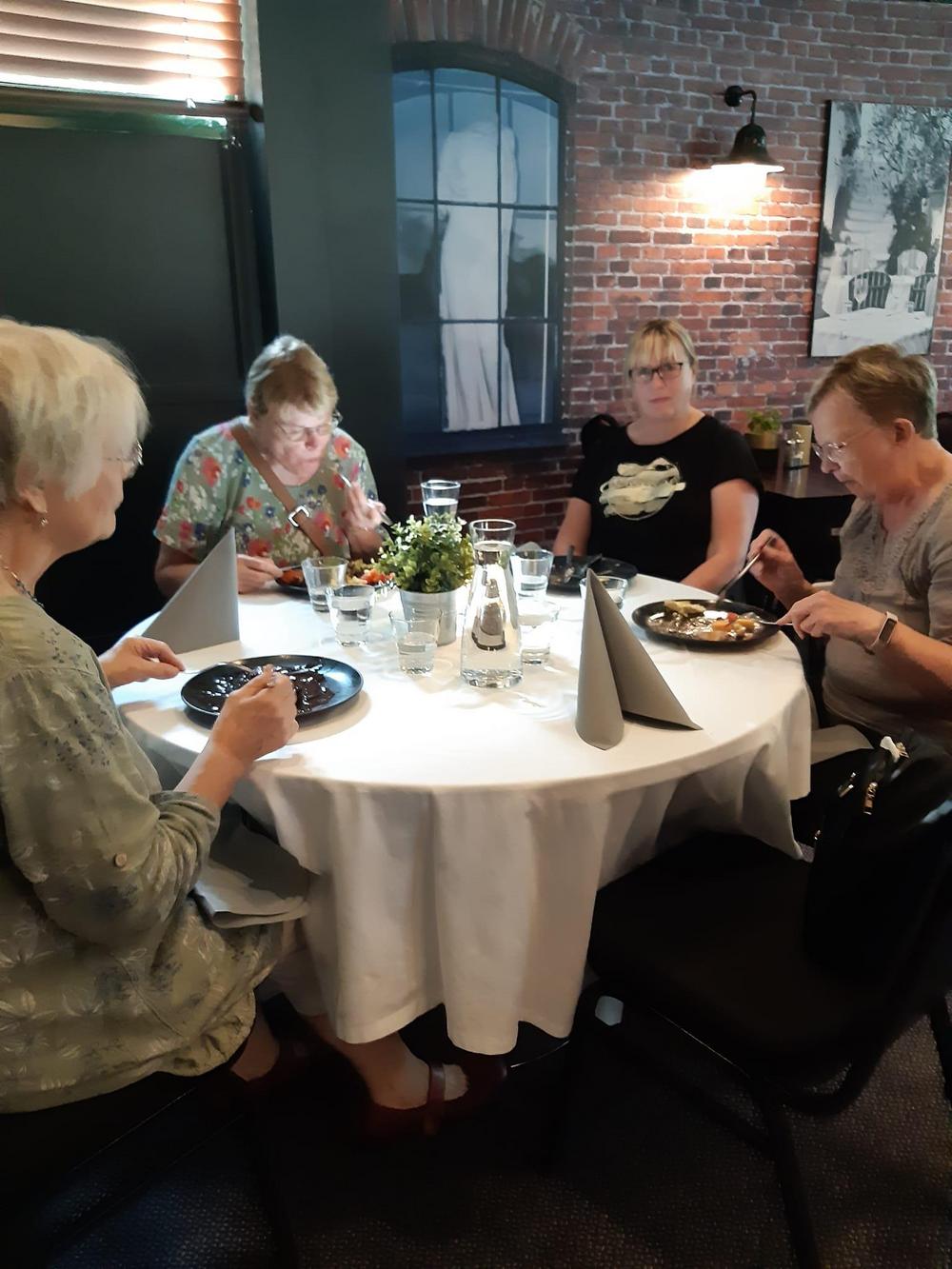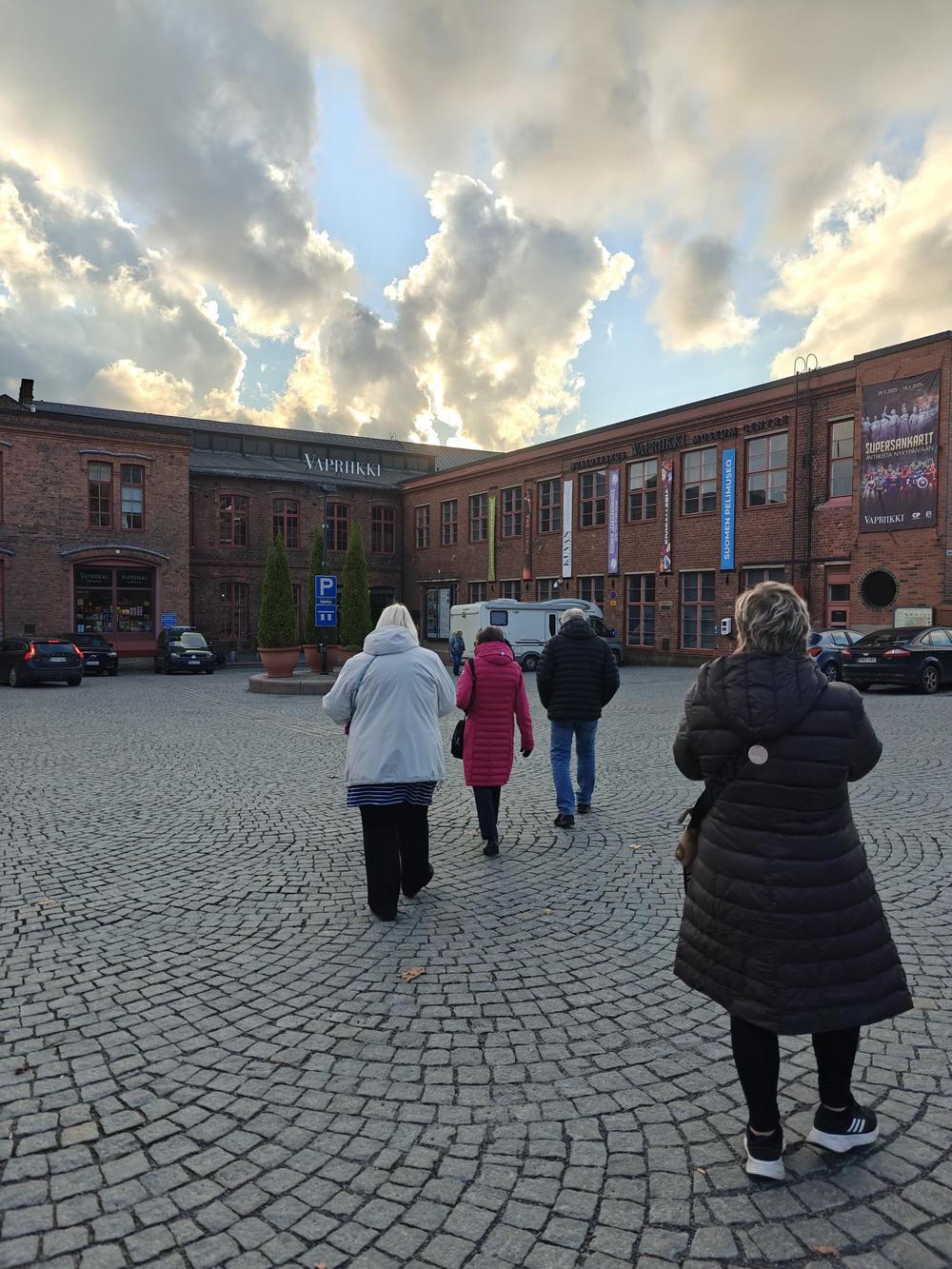 Aloitimme päivän Onnensillan yhteisökahvilassa. Sitten kiireesti pöytä puhtaaksi ja rautatieasemalle Tampereen junaan. Koska olimme jo tehneet päivän työn, vatsa vaati täydennystä. Meillä oli onneksi aikaa syödä rauhassa Panimoravintola Plevnassa. Maukasta ruokaa ja voi valita ison tai pienen annoksen. Jälkiruokaa emme ottaneet, koska tiedossa oli kakkukahvit Vapriikissa.