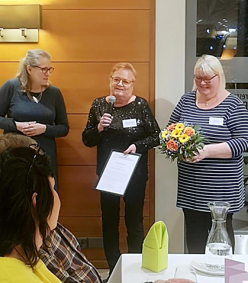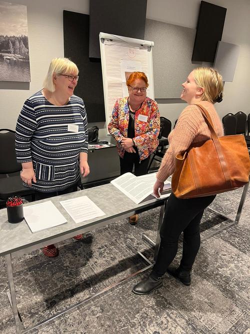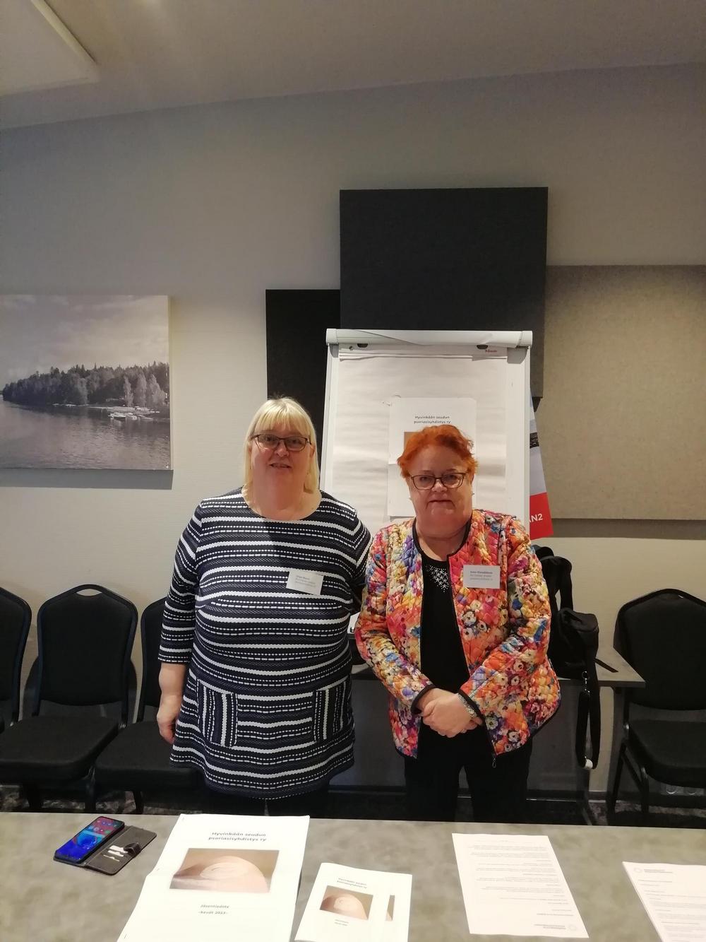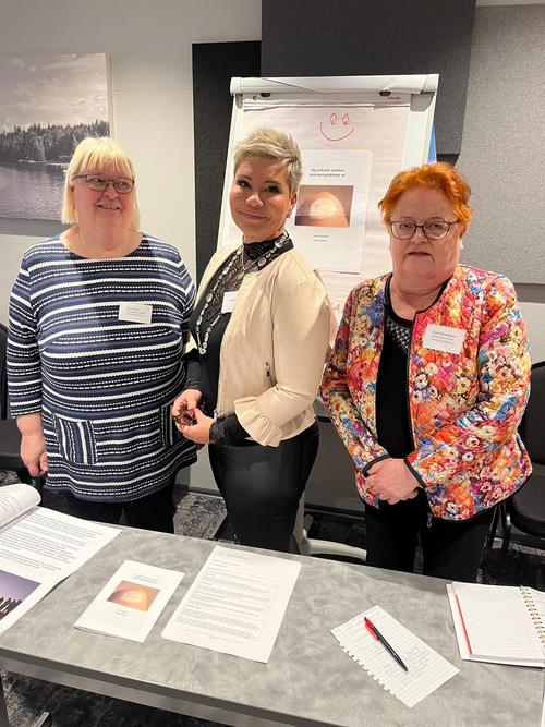 Psoriasisliiton järjestöpäivät pidettiin Hämeenlinnassa 11.-12.2.2023. Hyvinkään seudun Psoriasisyhdistyksestä olivat paikalla puheenjohtaja Irene Hämäläinen ja varapuheenjohtaja Sirpa Hurri kertomassa viime vuoden monista tapahtumista. Ensimmäisessä kuvassa Sirpan ja Irenen välissä Psoriasisliiton uusi puheenjohtaja Paula Werning.