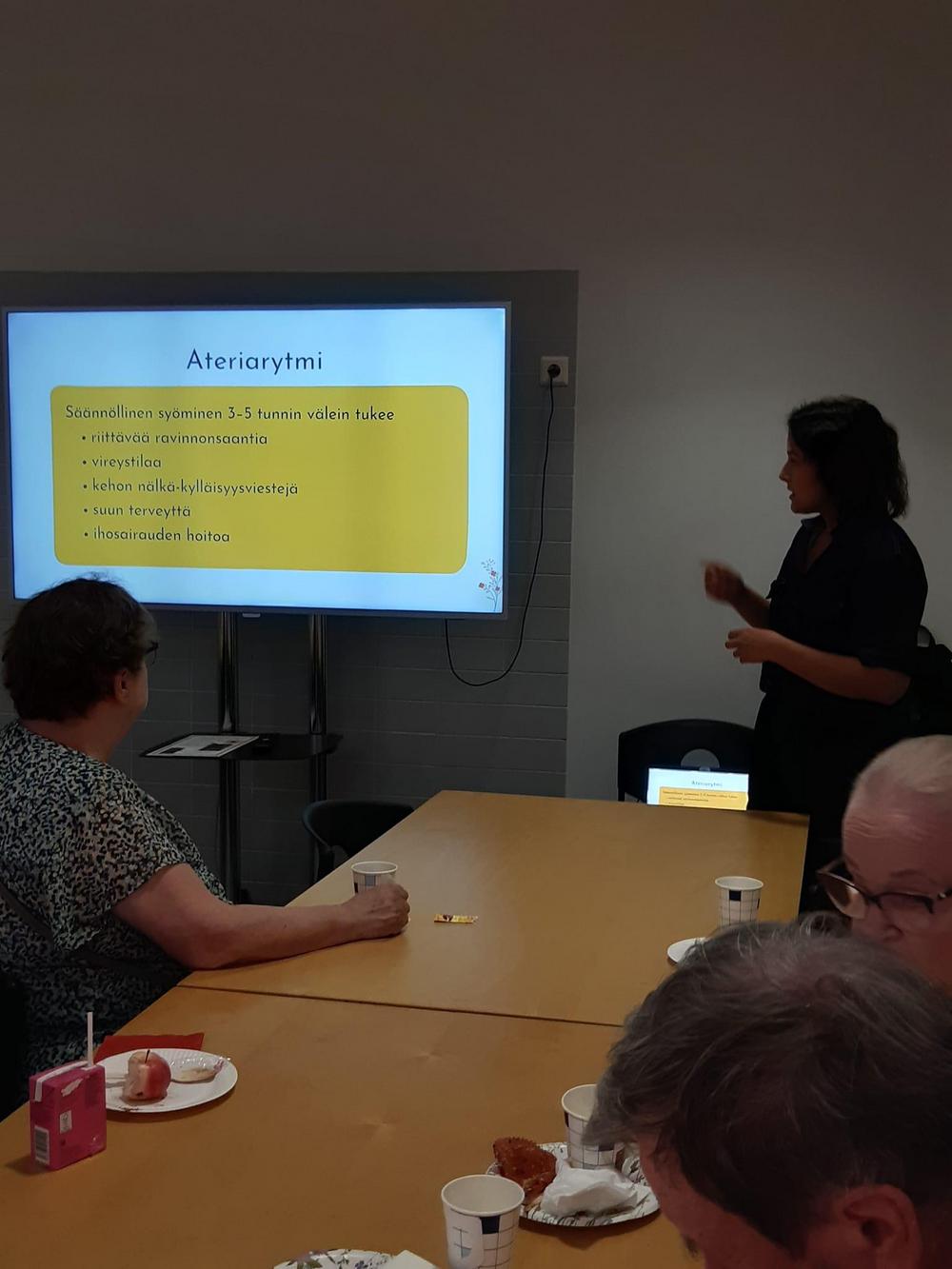 Ennen virallisen kokouksen alkua hyvinvointikeskus Vointilan Juulia, kertoi meille mm Punavalohoidon vaikutuksista.